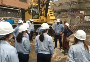 現場では、主任の竹田様(女性技術者)からの作業工程の説明、重機に乗り、杭に触れ、杭工事を間近で見学しました。生徒たちは手際のよい作業工程を、固唾をのんでみていました。また、若い女性の作業員への質疑応答もあり、建設業でも女性の社会進出が進んでいることを実感できたと思います。
